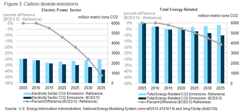 Projected annual electricity sector carbon dioxide emissions decrease significantly under the BCES12, to 20 percent below the Reference case level in 2025 and 44 percent below the Reference case level in 2035 (Figure 3, Table A1). For context, total energy-related carbon dioxide emissions in the BCES12 case trail the Reference case by 8 percent in 2025, and are almost 18 percent lower than in the Reference case by 2035. The BCES12 level of energy-related carbon dioxide emissions in 2035 is roughly consistent with a 20-percent decline in emissions from a 2005 baseline.