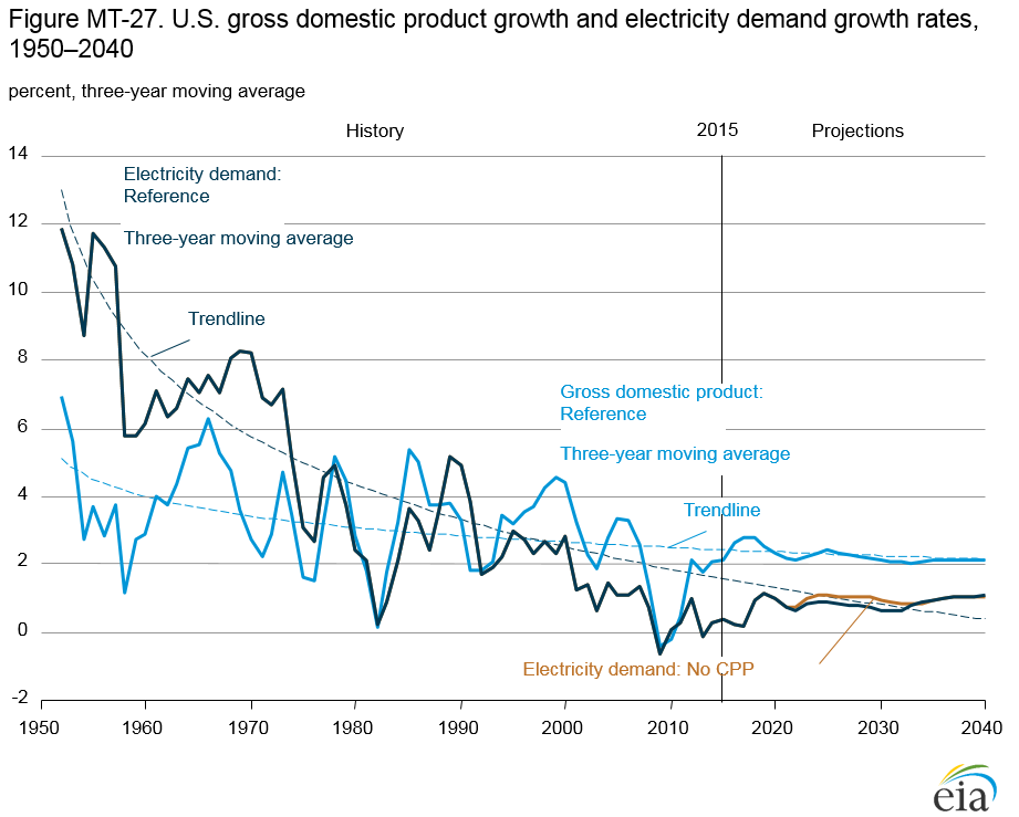 Electricity demand growth (including retail sales and direct use) has slowed in every decade since the 1950s, from 9.8%/year from 1949–59 to 0.5%/year from 2000–2015. In the AEO2016 Reference case and No CPP case, electricity demand growth remains relatively slow, as rising demand for electric services is offset by efficiency gains from new appliance standards and investments in energy-efficient equipment. Total electricity demand grows by 24% (0.9%/year) from 2015–40 in the Reference case, which includes the effects of the Clean Power Plan (CPP). In the No CPP case, demand increases by 27% from 2015–40 (1.0%/year). U.S. electricity demand is affected primarily by population growth and economic activity. However, electricity demand growth has been significantly slower than gross domestic product (GDP) growth in recent years and continues to be slower in the projections (Figure MT-27).