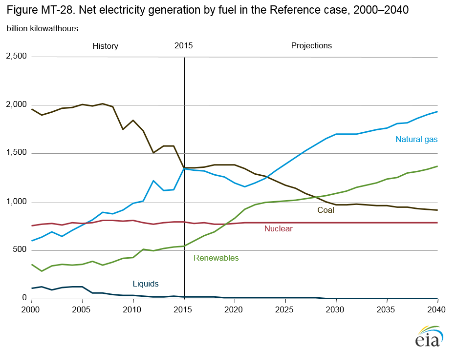 The decline in natural gas prices since 2009 has threatened the cost competitiveness of existing U.S. coal-fired generators, resulting in a 25% reduction in coal-fired generation in 2015 from its level in the mid-2000s. In the No CPP case, natural gas-fired generation roughly equals coal generation in the United States on an annual basis in 2016. After declining somewhat from 2016-20 with strong renewable growth as a result of tax credits, the natural gas share increases steadily in the No CPP case, overtaking the coal share in 2029 as the predominant fuel for electricity generation. In 2040, the natural gas share of total generation is 34% in the No CPP case.