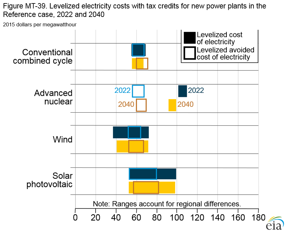 Factors that influence technology choices for new generating capacity are difficult to compare. Different technologies can have vastly different costs (capital, fuel, maintenance, financing), utilization rates, fuel resources, and value to the grid. The levelized cost of electricity (LCOE) is often used to compare costs among technologies with similar operating characteristics; the levelized avoided cost of electricity (LACE) is used to compare value across technologies with different duty cycles (Figure MT-39). LCOE—which represents the costs of building and operating a plant per kilowatthour of output over an assumed financial life and activity level (e.g., baseload, peaking, seasonal)—can vary significantly across regions and over time. Because solar photovoltaic (PV) and wind generation have no fuel costs and relatively small variable operation and maintenance costs, their LCOE is determined mostly by capital and financing costs. LACE, which represents the perkilowatthour value of generation to the electric grid, reflects the cost of the electricity displaced by the new technology. A technology is generally considered economically competitive when its LACE exceeds its LCOE.