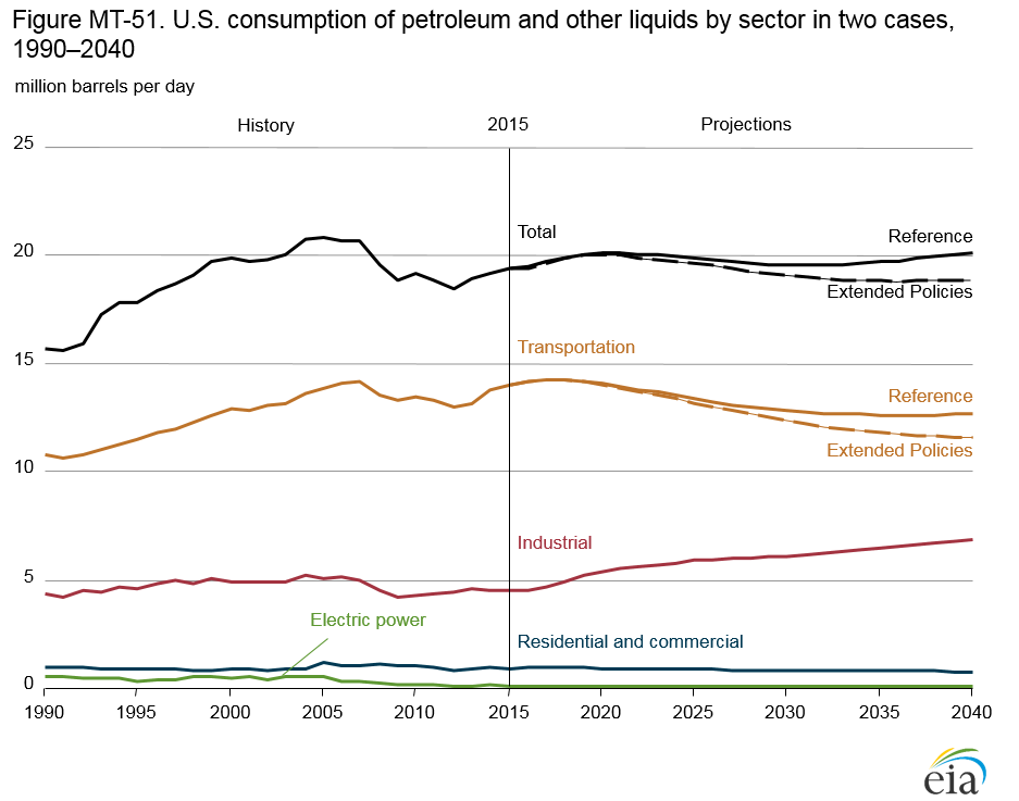 Consumption of petroleum and other liquids remains relatively flat in volumetric terms in the AEO2014 Reference case (Figure MT-50). While the transportation sector accounts for the largest share of total consumption throughout the projection, its share falls from 72% in 2013 to 65% in 2040, as a result of improvements in vehicle efficiency following the incorporation of corporate average fuel economy (CAFE) standards for both light-duty vehicles (LDVs) and heavy-duty vehicles (HDVs). In the industrial sector, consumption in the chemicals industry increases by 1.3 million barrels per day (MMbbl/d) from 2012 to 2040, largely reflecting higher volumes of hydrocarbon gas liquids as the sector benefits from increased U.S. production of natural gas. Consumption in all other industry segments decreases between 2012 and 2040.