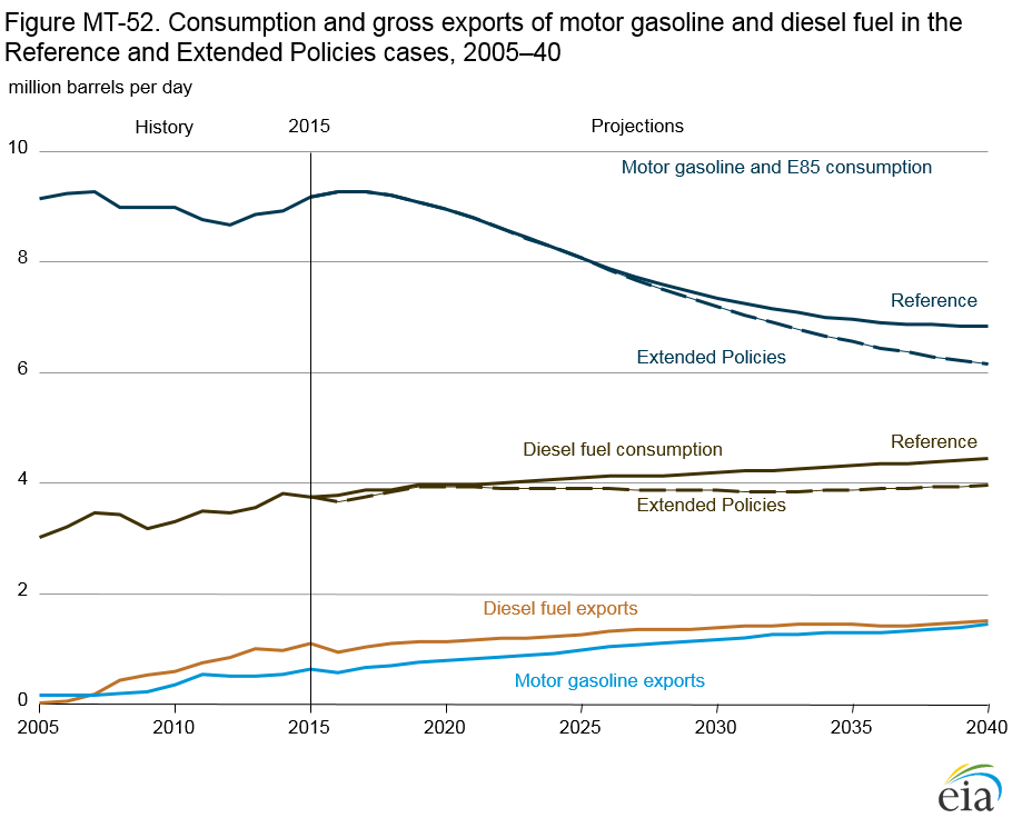 Based on the NHTSA and EPA GHG and CAFE standards, EIA projects that new light-duty vehicles (LDVs) will average approximately 47 mpg in 2025. These efficiency standards contribute to a decline in consumption of motor gasoline, while increases in vehicle miles traveled (VMT) and renewable fuel standards (RFS) lead to an increase in consumption of diesel fuel and ethanol in the Reference case. As a result of rising fuel economy standards, motor gasoline consumption by LDVs falls over the projection period while total VMT increase.