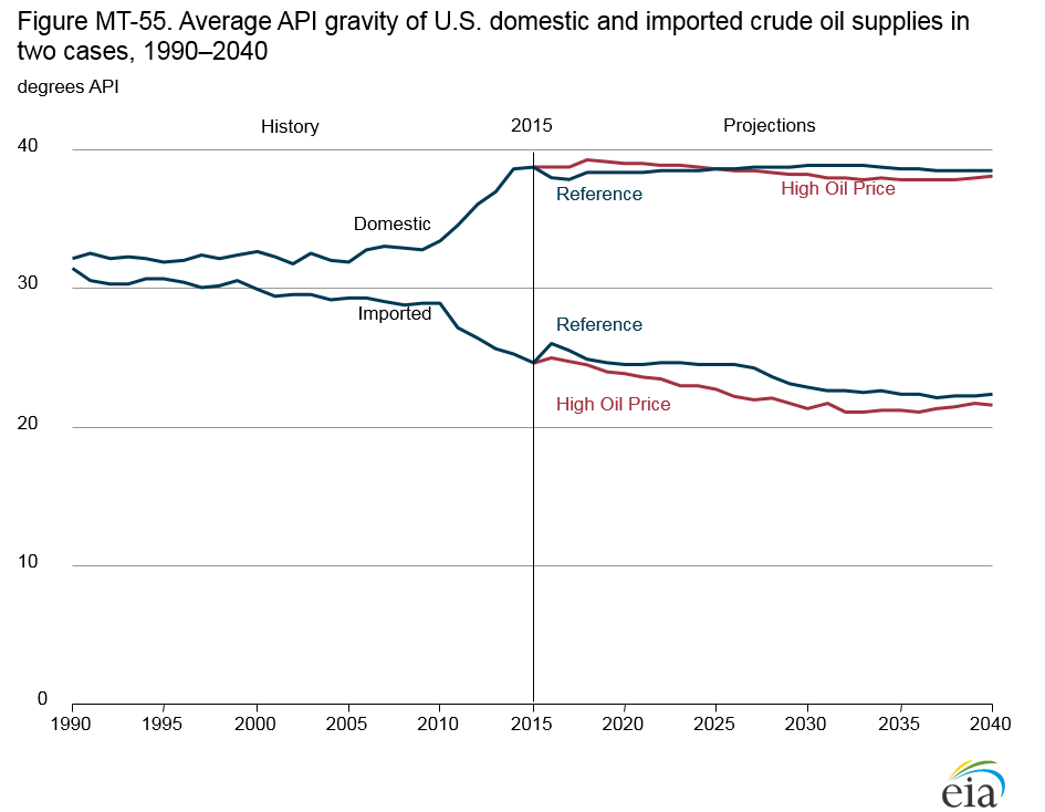 API gravity is a measure of the specific gravity, or relative density, of a liquid, as defined by the American Petroleum Institute. It is expressed in degrees, where a higher number indicates a lower density. Refineries generally process a mix of crude oils with a range of API gravities to optimize refinery operations. Over the past 15 years, the API gravity of crude oil processed in U.S. refineries has averaged between 30 and 32 degrees. As U.S. refiners run more domestic light crude oil produced from tight formations, they need less imported light crude to maintain an optimal API gravity. With increasing U.S. production of light crude oil in the AEO2014 Reference case, the average API gravity of crude oil imports declines from 27.6 degrees in 2012 to 25.6 degrees in 2040 (Figure MT-54).