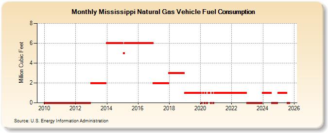 | Mississippi Natural Gas Vehicle Fuel Consumption (Million Cubic Feet) | ||||||||