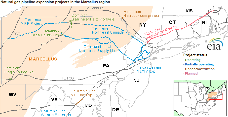 Multiple pipeline expansion projects are expected to begin service this winter to increase natural gas takeaway capacity from the Appalachian Basin's Marcellus Shale play, where production has increased significantly over the past two years. These new projects are largely focused on transporting gas to the New York/New Jersey and Mid-Atlantic regions and would have limited benefit for consumers in New England, where price spikes during periods of peak winter demand appear likely to persist.
