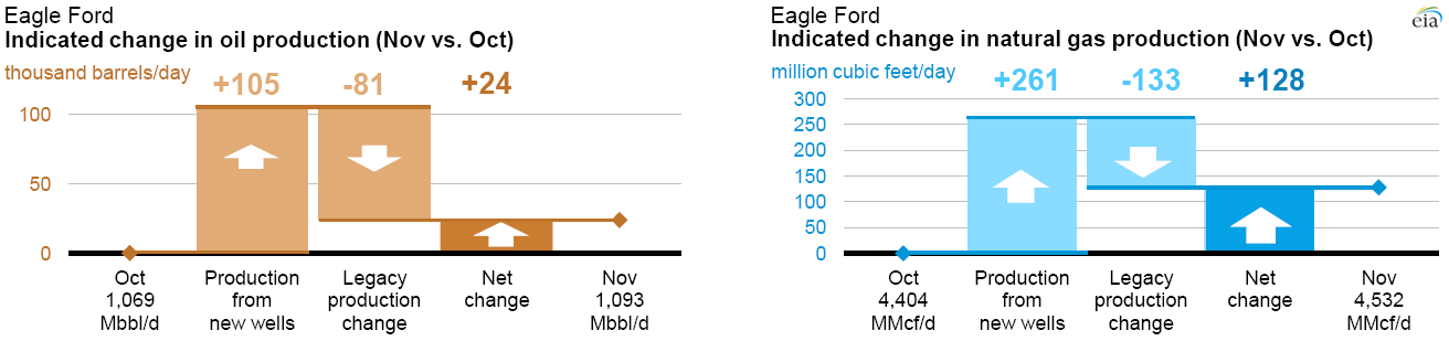The change in production volumes from one month to the next illustrates the positive and negative forces that affect production volumes in a given region. EIA estimates the month-to-month change in production by: