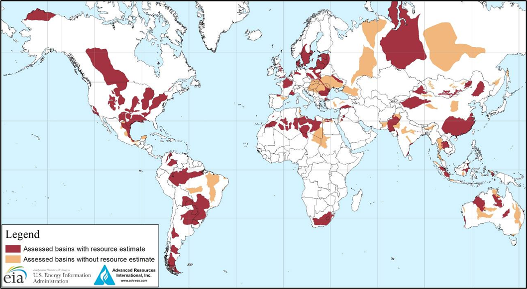 Technically Recoverable Shale Oil and Shale Gas Resources estimates that shale resources considered in conjunction with EIA's own assessment of resources within the United States indicate technically recoverable resources of 345 billion barrels of world shale oil resources and 7,299 trillion cubic feet of world shale gas resources (see Table 1). While the current report considers more shale formations than were assessed in the prior version of this assessment, it still does not assess many prospective shale formations, such as those underlying the large oil fields located in the Middle East and the Caspian region. Currently, only the United States and Canada are producing shale oil and shale gas in commercial quantities.
