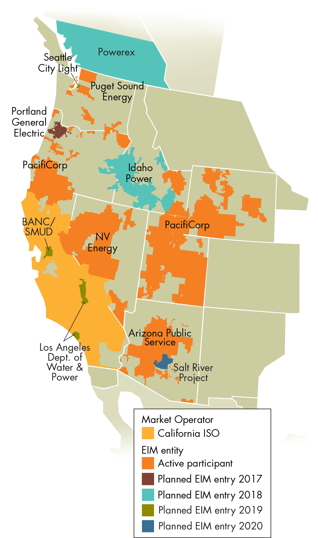 CAISO began the western EIM in the fall of 2014 with PacifiCorp as the initial cooperating entity. Since then, three more balancing authority areas—NV Energy, Arizona Public Service, and Puget Sound Energy—have joined. The EIM currently balances systems that supply 55% of electricity sales in the western grid of the Lower 48 United States. Six more U.S. balancing authority areas have announced plans to participate through 2020, expanding the system to cover another 16% of electricity sales in the western United States. In addition, Powerex, a subsidiary of the Canadian balancing authority BC Hydro, announced plans to join the EIM in 2018 and will be the first non-U.S. entity to participate.