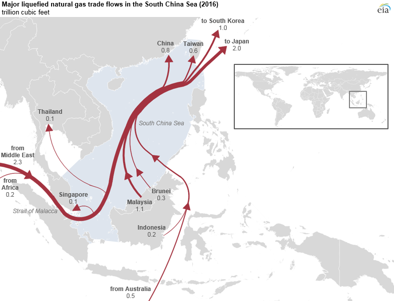 The South China Sea is a major route for liquefied natural gas (LNG) trade, and in 2016, almost 40% of global LNG trade, or about 4.7 trillion cubic feet (Tcf), passed through the South China Sea.