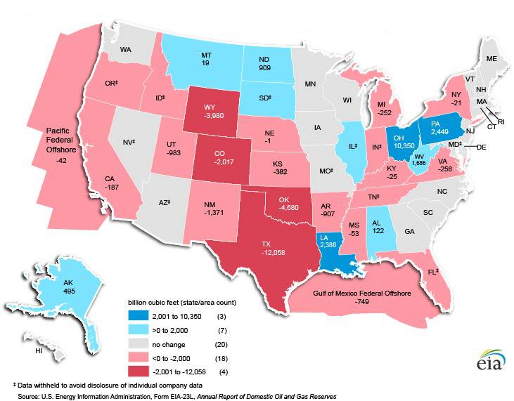 The largest net increase in proved reserves of U.S. natural gas in 2019 was in Ohio at 10.4 Tcf—the result of continuing development of the Utica/Pt. Pleasant shale play in the Appalachia Basin. Pennsylvania had the second-largest net increase at 2.4 Tcf in 2019, and Louisiana had the third-largest net increase at 2.4 Tcf. Development of the Marcellus and Haynesville shale gas plays outpaced the downward impact of the natural gas price decline.