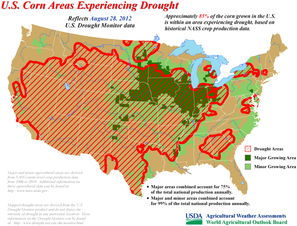 The U.S. Department of Agriculture (USDA) has reported a significant rise in the proportion of poor and very poor corn crops this summer, due largely to the extreme drought across much of the center of the nation. The corn crop in the affected region is a main feedstock for ethanol, which is blended into gasoline.