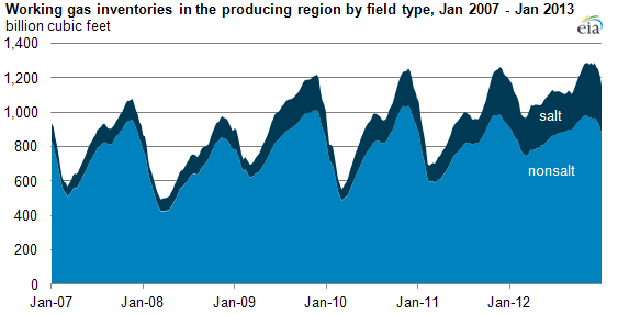 The Producing Region (which accounted for nearly 70% of 2011 U.S. marketed natural gas production, when including the Gulf of Mexico production volumes) has seen considerable growth in working gas capacities and inventories since 2007. This growth in working gas storage in the region has been driven mainly by continued growth at salt dome facilities. As a result, natural gas storage in salt dome facilities has driven the record-high levels of working gas established in the Producing Region in five of the last six years. Salt dome facilities in the Producing Region posted new 5-year (2008-12) maximum levels during each week of 2012 and exceeded this upper band in the first weeks of 2013.