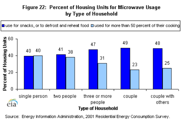 The "couple" household has the highest percentage of types of households (76 percent) that use the conventional oven between once per day and once per week. The percentages are between 68 and 76 percent for all types of households except for the "single-person" household, which has only 48 percent (figure 23).The single-person household also has the lowest percentage of housing units that has between one and two hot meals per day cooked in their home (figure 24) at 55 percent. Couples with others living with them have the highest at 73 percent. But the single-person household has the highest percentage of housing units that have a few hot meals per week cooked in their home at 27 percent. If both numbers in figure 24 are summed together, the lowest is the single-person at 82 percent and the highest is the couple at 91 percent. The single-person household is making hot meals, but just not as often. A possible explanation for this difference is the single-person household tends to go out to eat more often than other types of households.