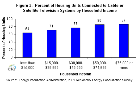 The 2001 RECS survey also shows an increase by income in whether the televisions are connected to a cable or satellite system (figure 3). Even for the lowest income bracket, the percent of households with cable or satellite television is 64 percent. This increases to 87 percent for the highest income level.
