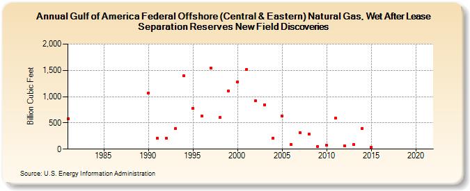 | Gulf of America Federal Offshore (Central & Eastern) Natural Gas, Wet After Lease Separation Reserves New Field Discoveries (Billion Cubic Feet) | |||||