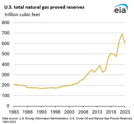 According to U.S. Crude Oil and Natural Gas Proved Reserves, Year-end 2023, as of December 31, 2023, U.S. total natural gas proved reserves—estimated as wet gas—was about 604 trillion cubic feet (Tcf), a 13% decline from their 2022 record of 691 Tcf.