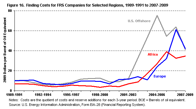 figure data For the U.S. Onshore, U.S. Offshore, and Foreign regions, finding costs fell the most in the U.S. Offshore in 2007-2009, bringing its costs closer to the lower cost U.S. Onshore and Foreign regions (Figure 17). The U.S. Offshore has had the highest finding costs of these three regions since 2001-2003, and the fall in its finding costs was its largest since 1981-1983, when data are first available. 19 U.S. Onshore and Foreign finding costs also fell in 2007-2009, but not as steeply as the U.S. Offshore. All three regions experienced climbing finding costs in the mid-2000s, with those of the U.S. Offshore skyrocketing. The increases for the U.S. Offshore were reversed in the 2005-2007 period, with the region falling an amount that was at the time the largest of any decline of the three regions since 1981-1983.