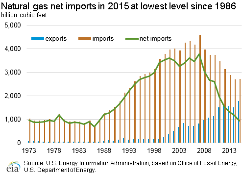 - Natural gas imports—97% of which arrive via pipeline from Canada—have decreased almost every year since 2007. In 2015, natural gas imports were the lowest level (2,626 Bcf) since 1994. Natural gas imports from Mexico were minimal in 2015.