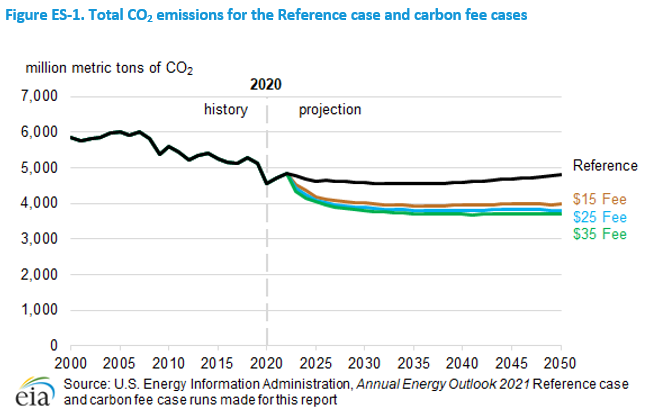 The AEO2021 Reference case contains the 2020 COVID-19-related drop and later increase in energy demand and related CO2. The 2022 emissions level (the last year before the fee is implemented) is projected to be 4,845 million metric tons (MMmt), or about 6% above 2020 and about 6% below 2019 levels.