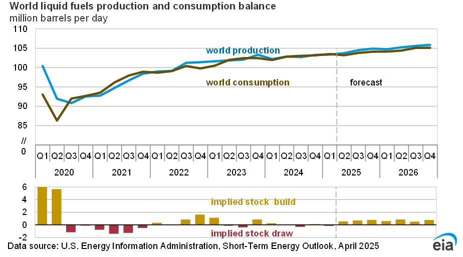 Forecast global liquid fuels consumption increases by 1.1 million b/d in 2025 and by 1.2 million b/d in 2026. Global liquid fuels consumption growth is driven almost entirely by non-OECD countries.