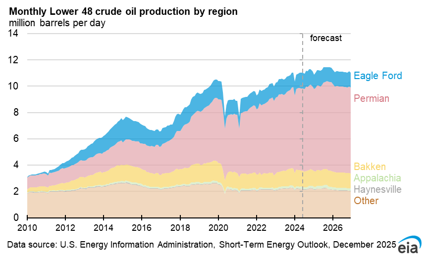 The Brent crude oil spot price averaged $64 per barrel (b) in November, which is $11/b lower than in November 2024. Crude oil prices continue to fall as growing crude oil production outweighs the effect of increased drone attacks on Russia’s oil infrastructure, and the latest sanctions on Russia’s oil sector. We forecast that growing global oil production and lower demand over the winter will accelerate the accumulation of oil inventories, resulting in further crude oil price declines in the coming months. We forecast that the Brent price will drop to an average of $55/b in the first quarter of 2026 (1Q26) and will stay near that price for the rest of the year.