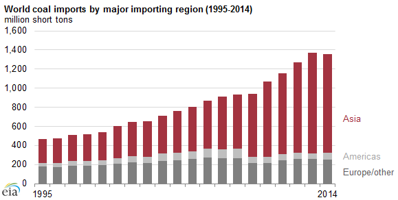 Lack of growth in global demand for coal imports in 2014 and 2015 has led to significant declines in coal export sales from Indonesia and the United States. Export sales from other countries/regions, including Australia, Eurasia, southern Africa, and South America, are on track to be near or slightly higher in 2015 compared with 2013. U.S. coal exports are down primarily because of their higher production costs relative to other coal exporting countries. The decline in Indonesian exports is attributed primarily to China's reduced demand for imported coal accompanied by reduced demand in both China and India for Indonesia's lower-quality export coals.