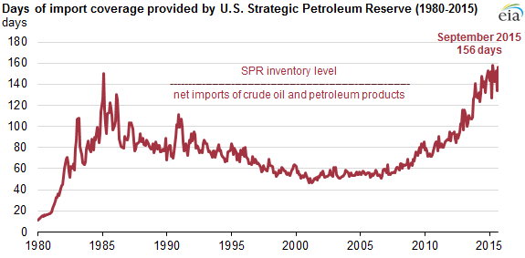 As a member of the International Energy Agency (IEA), the United States is obligated to maintain stocks of crude oil and petroleum products, both public and private, to provide at least 90 days of import protection and to collectively participate in the release or sale of oil supplies to help balance a shortage among IEA members in the event of a severe energy supply disruption. Based on September levels of net crude oil and petroleum product imports, the SPR alone holds crude oil stocks equivalent to 156 days of import protection. Including average levels of commercial stocks over the past 5 years, total days of import coverage provided by strategic and commercial stocks is currently 450 days. The IEA obligation is only one consideration for policymakers in determining the size and composition of SPR holdings.