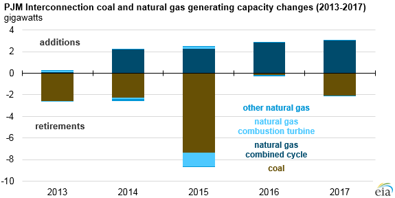 The addition of new natural gas-fired capacity and the retirement of older generating units, mostly coal, have also affected PJM’s electricity generation mix. From 2013 through 2017, 14.4 gigawatts of coal capacity in PJM was retired, or about 19% of the region’s total. About 1.8 GW of natural gas-fired capacity was also retired, but 11.0 GW were added, increasing the region’s natural gas capacity by 18%. Of that added natural gas capacity, 95% was combined cycle.
