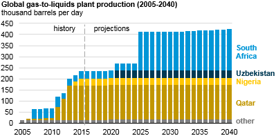 EIA’s International Energy Outlook 2017 (IEO2017) projects that liquids produced at gas-to-liquids (GTL) plants will increase as two large-scale projects are completed in South Africa and Uzbekistan. Most of the new GTL capacity will come from the conversion of Sasol’s coal-to-liquids plant in Secunda, South Africa, to a GTL facility. That conversion is expected to be completed by 2024. More ›