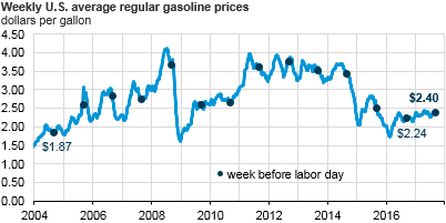 Hurricane Harvey, which first made landfall on August 25, 2017, has created considerable uncertainty for gasoline supply and prices, as the area affected by the hurricane is home to much of the nation's petroleum infrastructure. On August 28, the U.S. average retail gasoline price was $2.40 per gallon (gal), the second-lowest price on the Monday before Labor Day since 2004. More ›