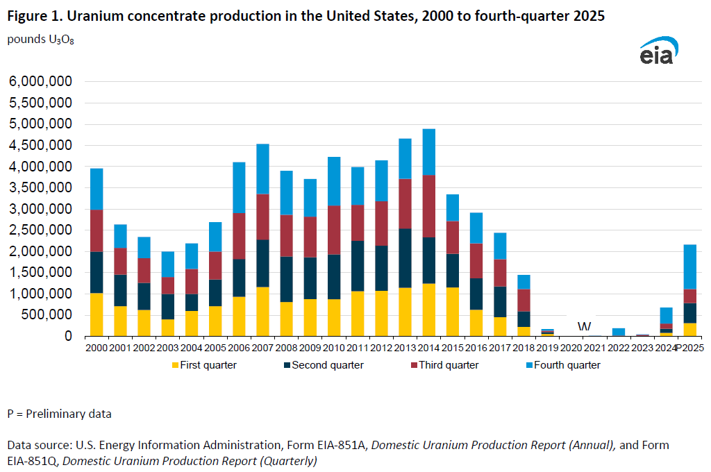 U.S. production of uranium concentrate (U3O8) in the fourth quarter of 2025 totaled 1,043,474 pounds U3O8, a 217% increase from third quarter production of 329,623 pounds U3O8. This quarter’s total uranium production occurred at seven facilities, four in Wyoming (Ross CPP, Lost Creek Project, Smith Ranch-Highland Operation, and Willow Creek Project), one in Texas (Alta Mesa), one in Utah (White Mesa), and one in Nebraska (Crow Butte)s.